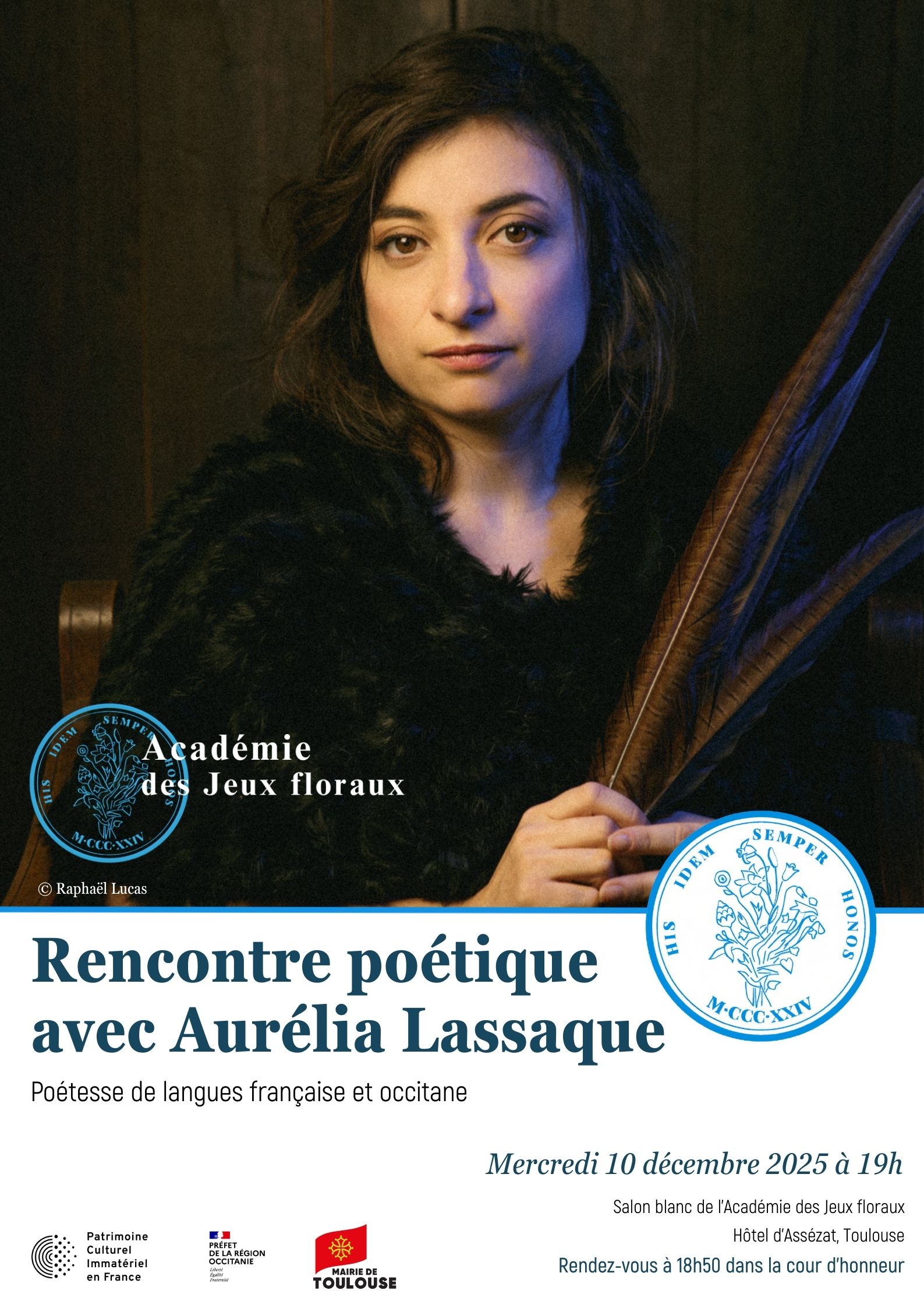Aurélia Lassaque est poète de langues française et occitane. Elle a parcouru le monde en poète de l’Europe à la Chine en passant par l’Amérique du Nord et du Sud, la Scandinavie, l’Indonésie et l’Inde pour donner des lectures et spectacles mariant la poésie à la musique, au chant, à la vidéo ou à la danse. Ses recueils Pour que chantent les salamandres et En quête d’un visage (Editions Bruno Doucey) ont été traduits en plusieurs langues. Elle est maître ès Jeux de l’Académie.